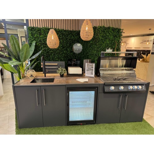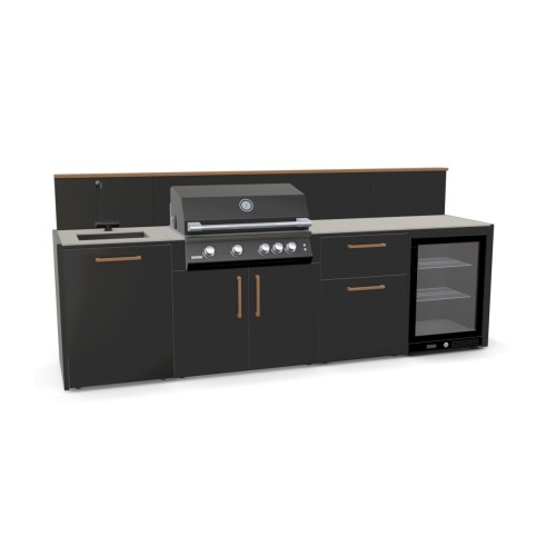 Sestavte si venkovní kuchyni přesně podle svých představ – náš modulární systém vám dává naprostou volnost v uspořádání a konfiguraci. Můžete si vybrat z široké škály komponentů, od různých typů grilů a chladniček, až po dřez s vodovodní baterií a variabilní úložné skříňky. Zvolit si můžete i materiál madel, barvu skříněk, provedení zadní stěny a především odstín pracovní desky z elegantního kamene.