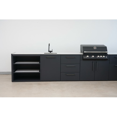 Sestavte si venkovní kuchyni přesně podle svých představ – náš modulární systém vám dává naprostou volnost v uspořádání a konfiguraci. Můžete si vybrat z široké škály komponentů, od různých typů grilů a chladniček, až po dřez s vodovodní baterií a variabilní úložné skříňky. Zvolit si můžete i materiál madel, barvu skříněk, provedení zadní stěny a především odstín pracovní desky z elegantního kamene.