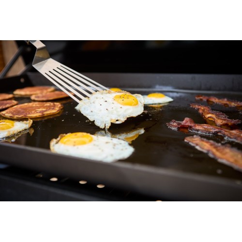 Díky své konstrukci je tato obracečka ideální pro použití na nerezových mřížkách i litinových plátech. Rukojeť s měkčeným protiskluzovým povrchem zajišťuje bezpečný úchop a pohodlnou manipulaci, i když máte na rukou grilovací rukavice. Prodloužená délka pak zaručuje, že vaše ruce zůstanou v bezpečné vzdálenosti od sálajícího tepla.