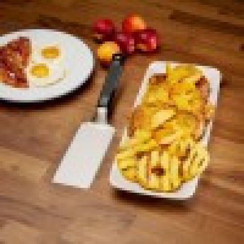 Náš tip: Používejte jednu špachtli k přidržování a druhou k obracení nebo krájení. Po skončení přípravy suroviny jednoduše naberte špachtlí přímo na talíř. Škrabku mějte vždy po ruce pro průběžné očištění povrchu – váš tál tak zůstane v perfektní kondici po celou sezónu.