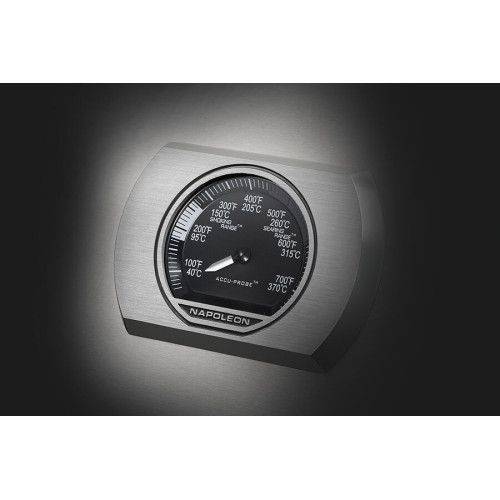 Teploměr ACCU-PROBE™: Přesný teploměr ve víku s chromovaným rámečkem pro sledování vnitřní teploty bez otevírání grilu.